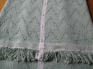 Here is the finished baby blanket. This first picture is a little blurry. I washed it by hand in warm water and it softened up nicely. I've heard that bamboo is dry clean only, but I've also heard that the more it is washed, the softer it will get. I'm tempted to throw it in the washer to see what happens. I figure anything that is going to be around a baby shouldn't be too precious to throw in a washer.